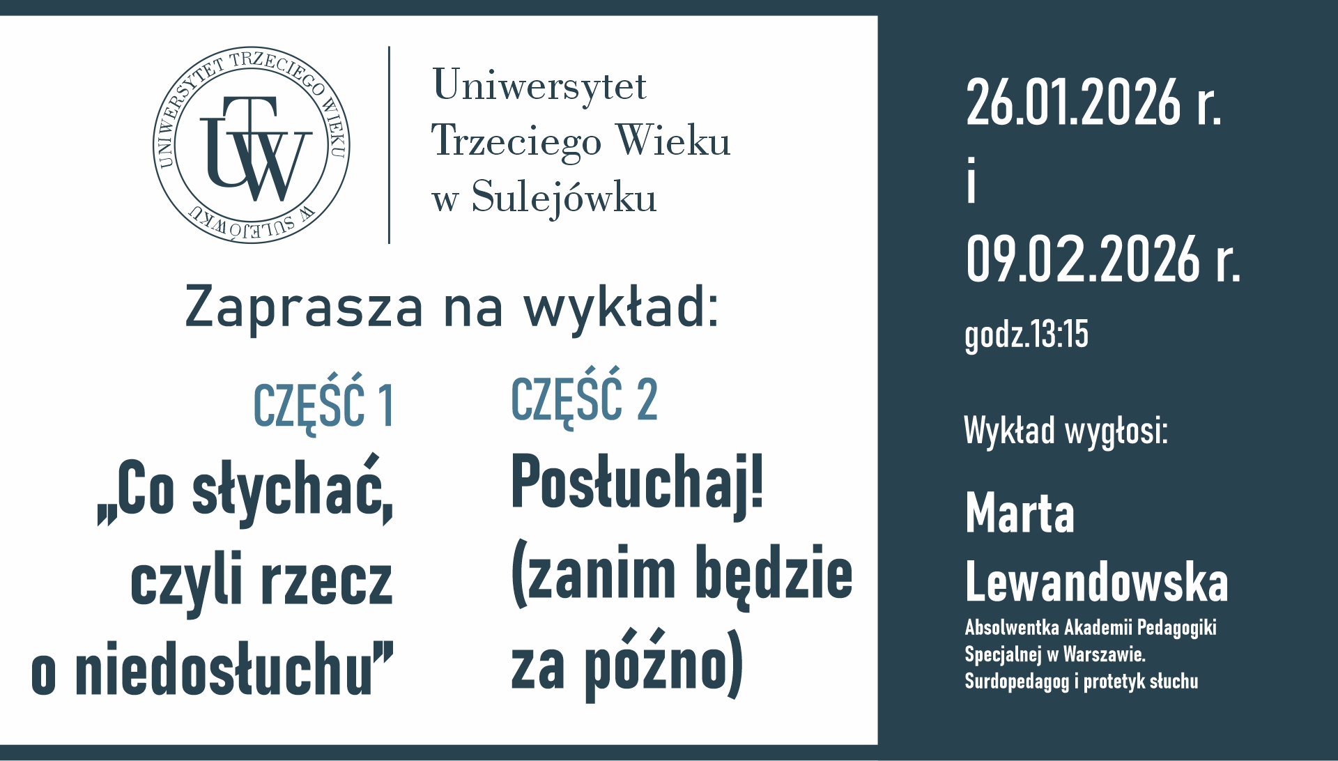 Zapraszamy słuchaczy Uniwersytetu Trzeciego Wieku na drugie spotkanie z cyklu poświęconego jednemu z najważniejszych wyzwań współczesności – niedosłuchowi.