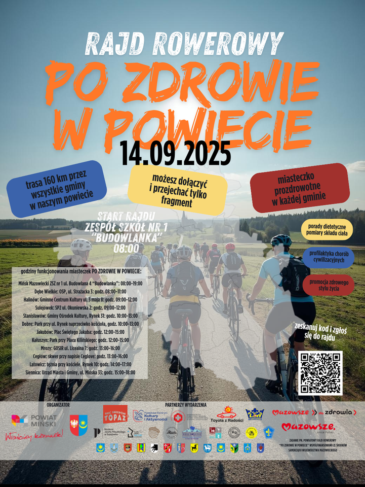 Już 14 września 2025 r. zapraszamy na wyjątkową rowerową podróż po wszystkich gminach Powiatu Mińskiego! Jednego dnia pokonamy trasę liczącą ok. 160 km. Na trasie czekają na Was Miasteczka Prozdrowotne – przygotowane wspólnie przez Powiat Miński, gminy, OSP, Szpital Powiatowy, Koła Gospodyń Wiejskich, harcerzy ZHP oraz instytucje kultury. Każda gmina to inne atrakcje i aktywności dla mieszkańców.