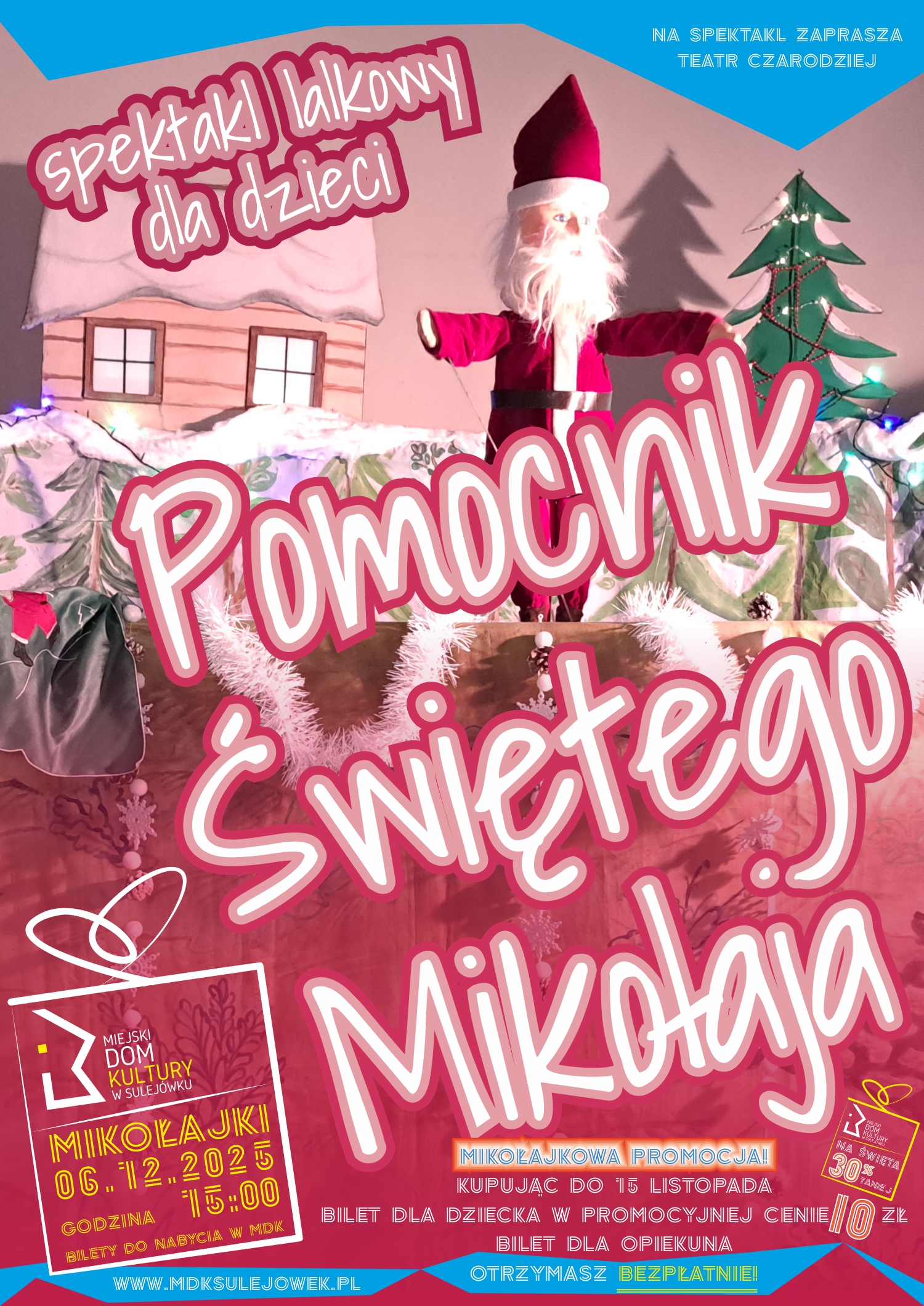 Z okazji Mikołajek zapraszamy na wyjątkowy spektakl teatralny o tym, jak pewien elf marzył o zostaniu pomocnikiem Świętego Mikołaja. W trakcie przedstawienia na scenie pojawią się Mikołaj, Pani Mikołajowa, Elf, Renifer oraz psotny Chochlik, którzy razem zabiorą dzieci w pełną humoru i ciepła świąteczną opowieść.