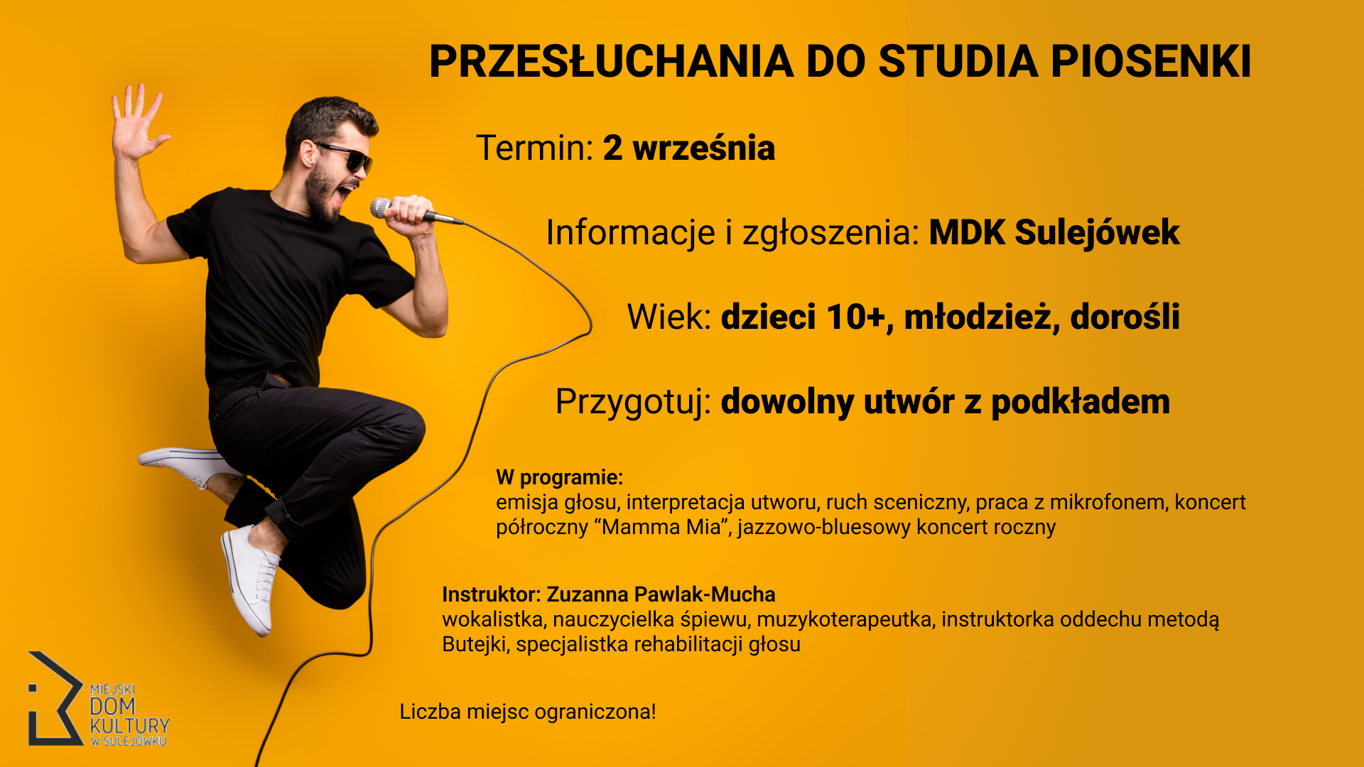 Kochasz śpiewać i pragniesz rozwijać swój talent?Czekamy właśnie na Ciebie!Zapraszamy wszystkich chętnych powyżej 10-go roku życia na przesłuchania do Studia Piosenki.Przygotuj: dowolny utwór wraz z...