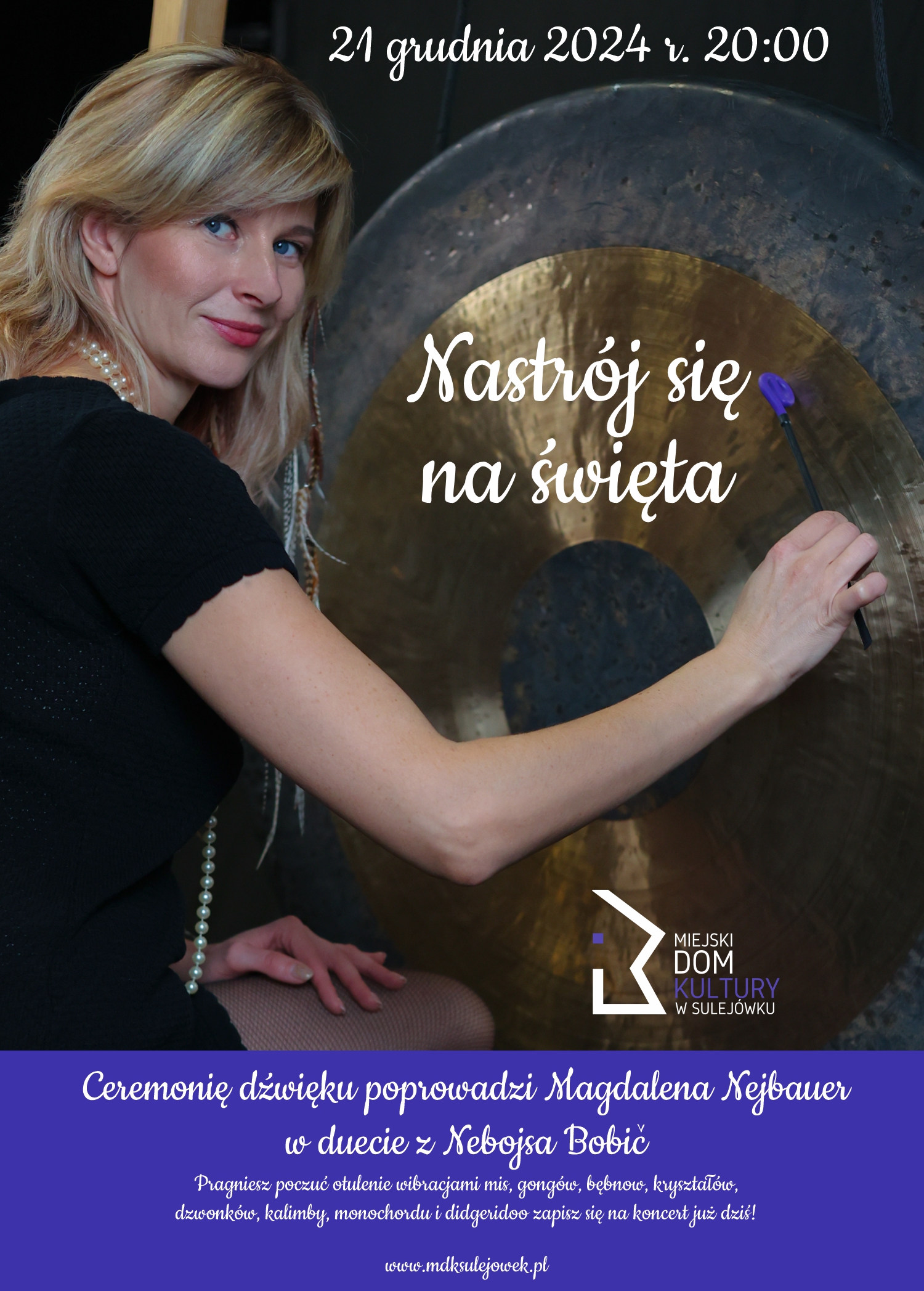 Magdalena Nejbauer - Muzykoterapeutka, muzykolog i aktywny muzyk. Przez wiele lat otaczały mnie dźwięki harmoniczne. Ukończyłam IV stopniowy kurs masażu misami dźwiękowymi oraz liczne kursy zastosowania gongu w relaksacji grupowej i terapii. Jestem zwolenniczką aktywowania naturalnych procesów oczyszczania i samouzdrawiania organizmu.