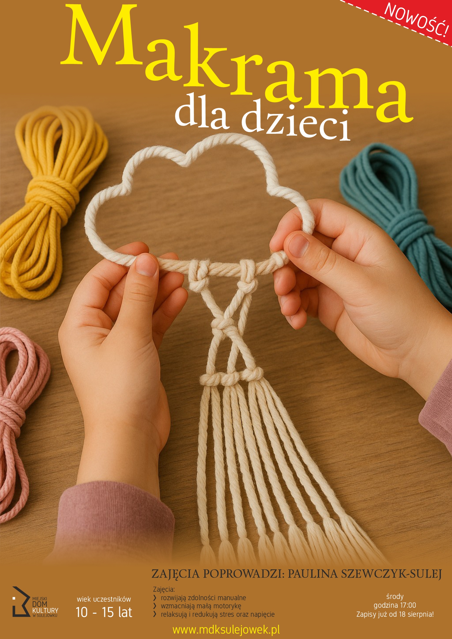 To idealna okazja, aby mali artyści rozwijali swoją kreatywność, cierpliwość i zdolności manualne. Pod okiem doświadczonej instruktorki Pauliny Szewczyk-Sulej dzieci nauczą się podstawowych technik wiązania makramy, tworząc własne kolorowe ozdoby, np. bransoletki, zawieszki i dekoracje ścienne do pokoju, różne ozdoby tematyczne.