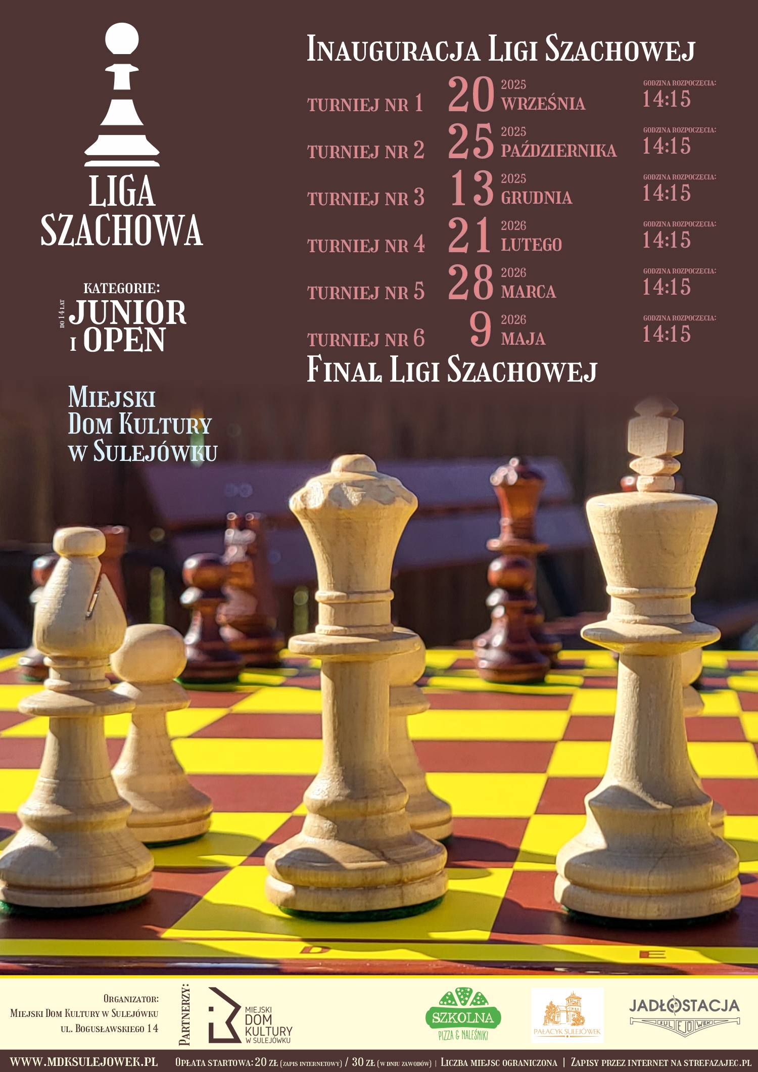 Zapraszamy serdecznie na finał Ligi Szachowej w Sulejówku, w sezonie 2025/2026. Finałowy turniej odbędzie się 09.05.2026 o godz. 14:15.