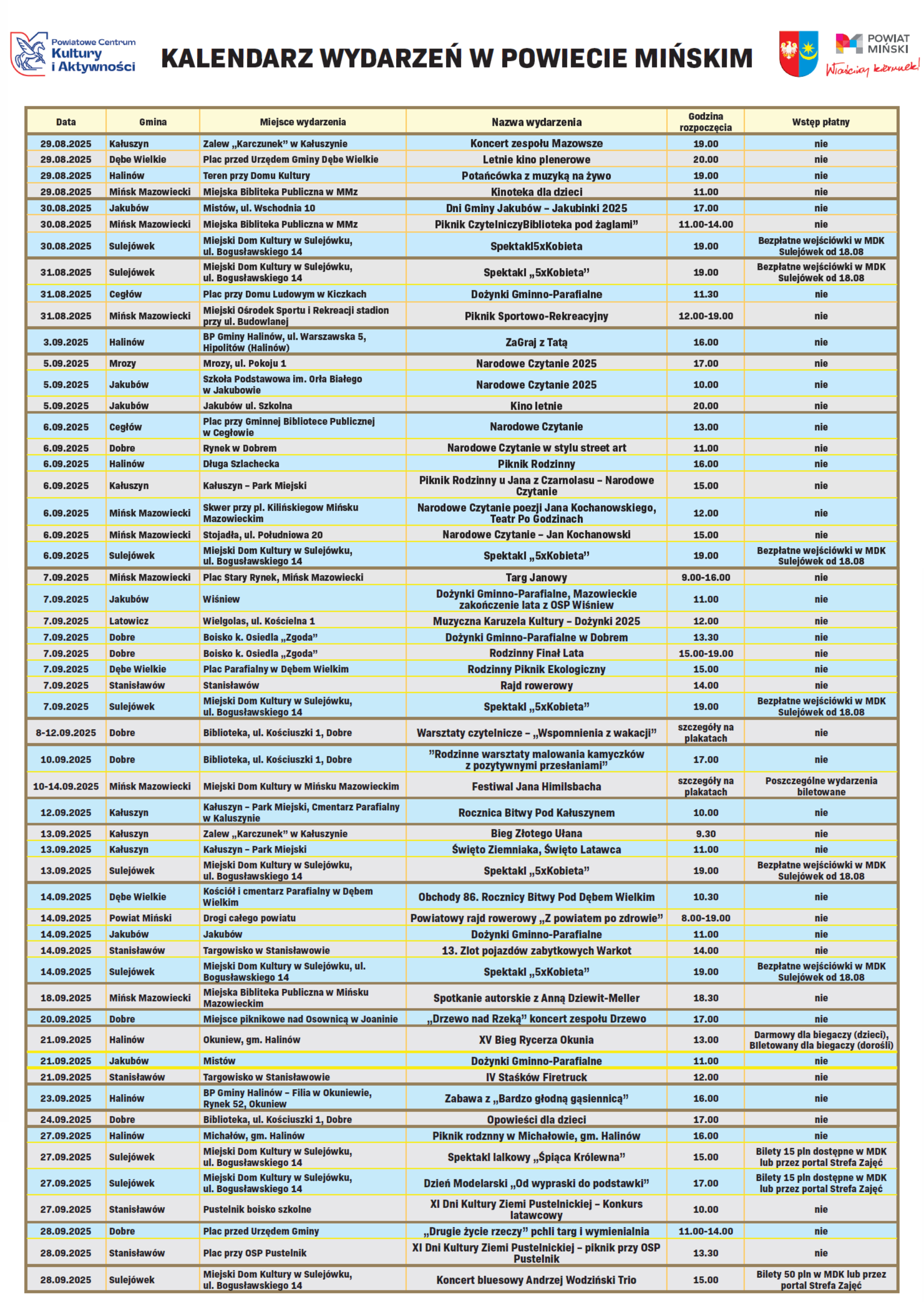 Powiatowe Centrum Kultury i Aktywności prezentuje Kalendarz wydarzeń kulturalnych na wrzesień 2025 roku, które zostały zaplanowane w gminach naszego powiatu. Zapraszamy do lektury i udziału w bardzo ciekawych przedsięwzięciach. Kalendarz w wersji pdf znajduje się w załączeniu.