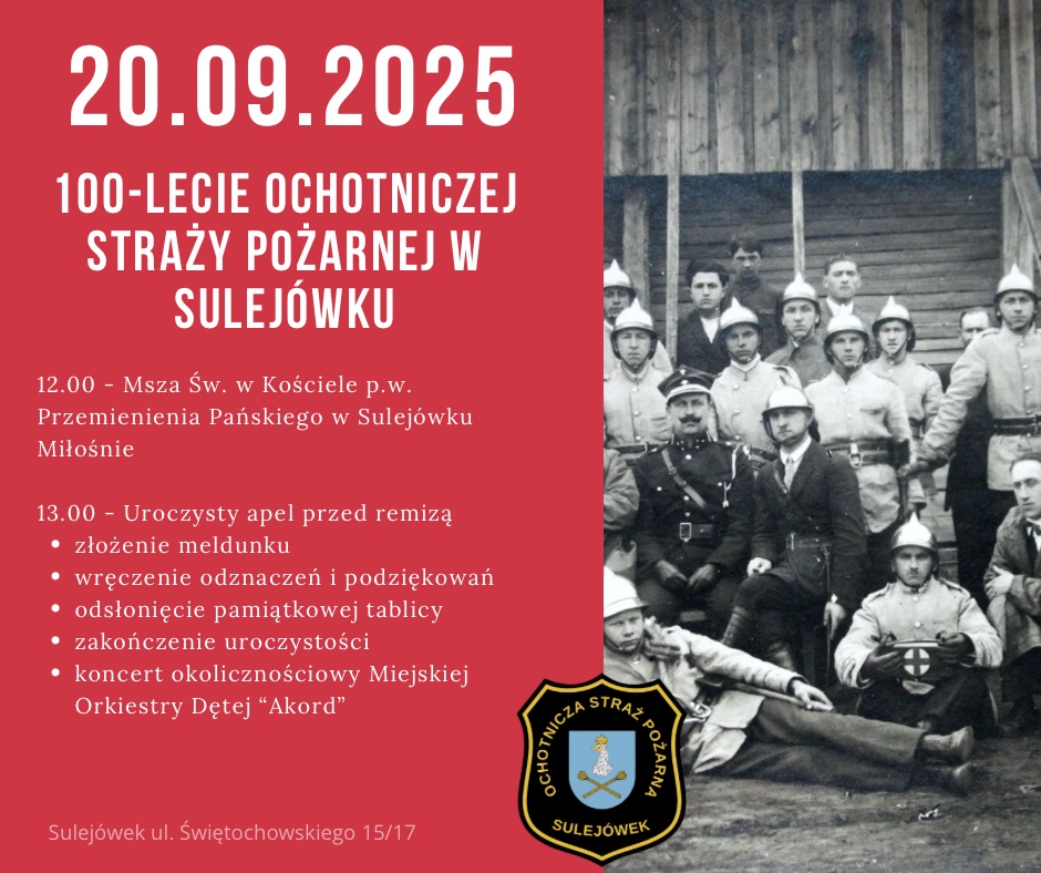 Ochotnicza Straż Pożarna w Sulejówku ma zaszczyt zaprosić na jubileusz 100-lecia jednostki.