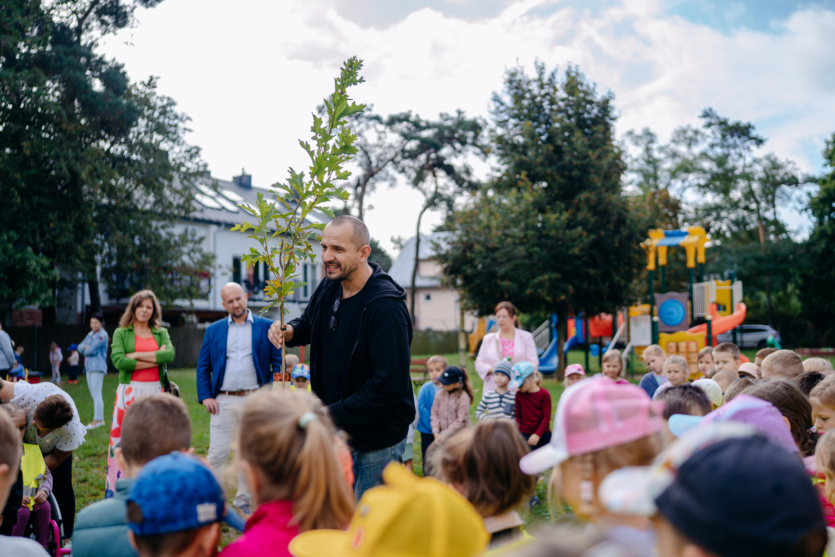 To jednak nie była jedyna pamiątka po tym spotkaniu! Na terenie Przedszkola wspólnie posadziliśmy dąb błotny – drzewo wyjątkowe, które dzieci będą mogły obserwować każdego dnia, gdy będą przychodzić do przedszkola. Z roku na rok będzie rósł coraz wyżej, a już za kilka lat stanie się domem dla ptaków, miejscem odpoczynku dla owadów i źródłem cienia w upalne dni.