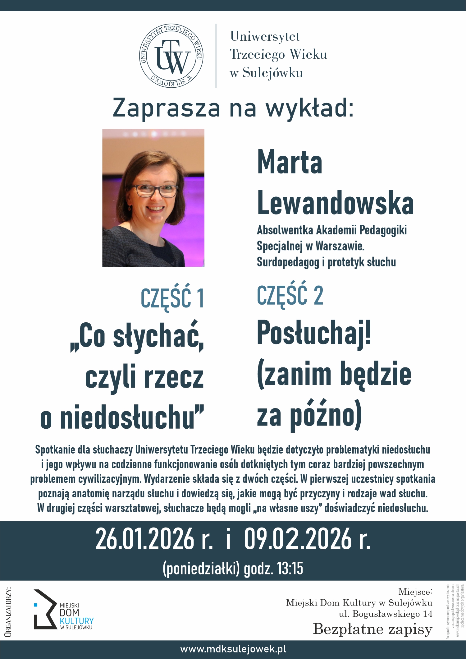 Zapraszamy słuchaczy Uniwersytetu Trzeciego Wieku na drugie spotkanie z cyklu poświęconego jednemu z najważniejszych wyzwań współczesności – niedosłuchowi.