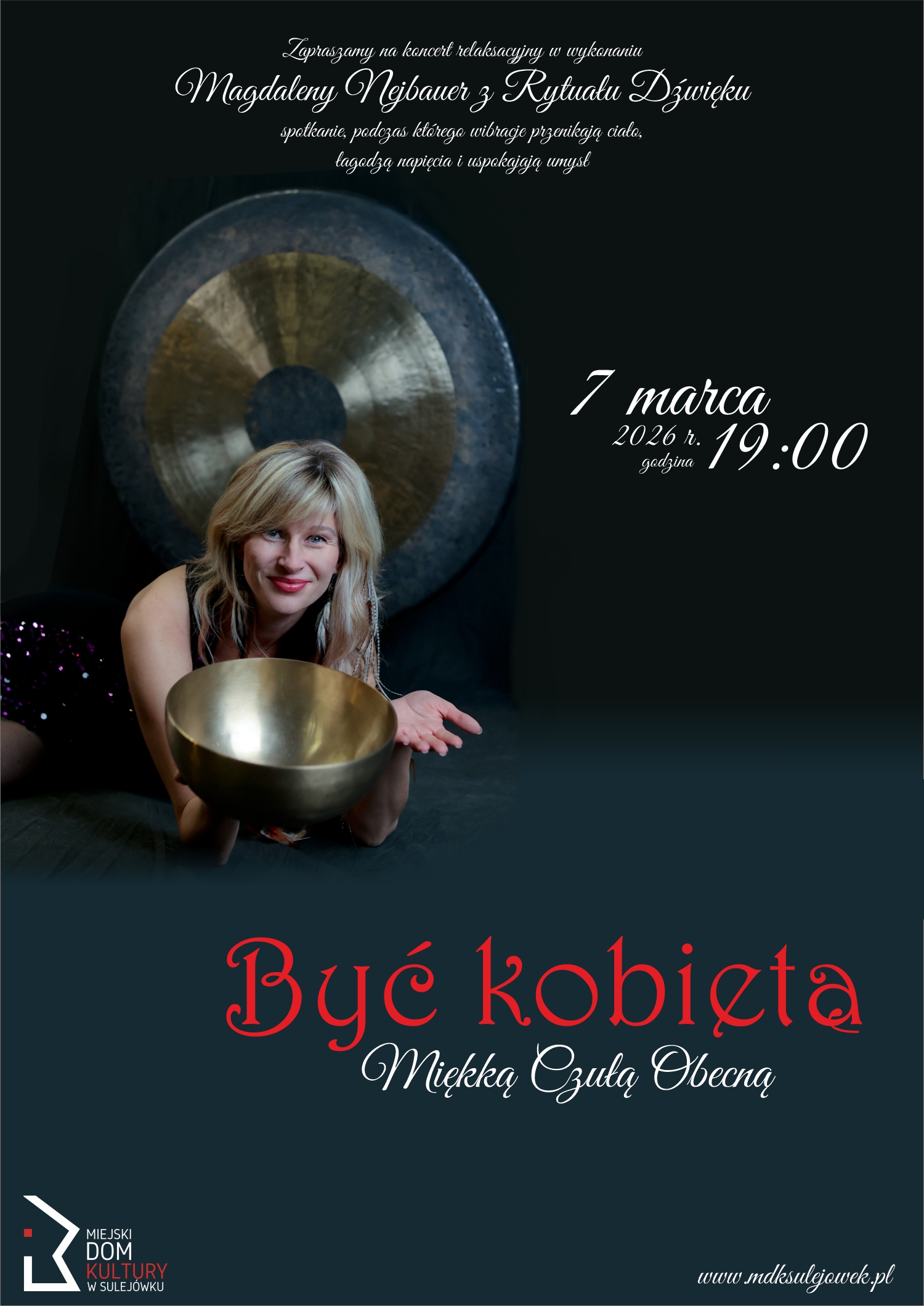 Koncert poprowadzi Magdalena Nejbauer – muzykoterapeutka pracująca w nurcie holistycznym, która od lat wspiera innych poprzez dźwięk. Prowadzi procesy emocjonalne z użyciem mis, masaże dźwiękiem oraz koncerty relaksacyjne, tworząc przestrzeń do głębokiego ukojenia i regeneracji.