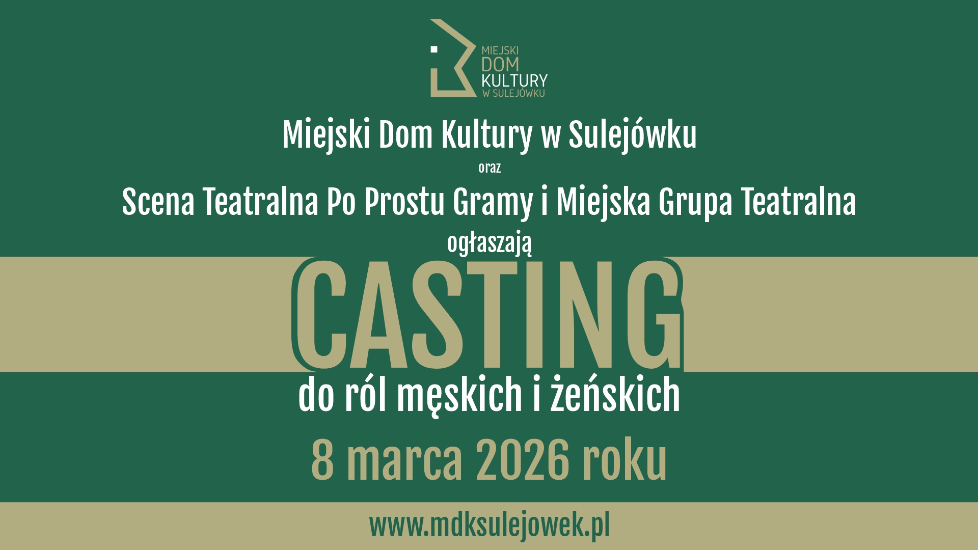 Miejski Dom Kultury w Sulejówku zaprasza do udziału w castingu do premierowego spektaklu teatralnego "Nasze miasto” autorstwa Thorntona Wildera, realizowanego w reżyserii Mirosława Kuleszy.