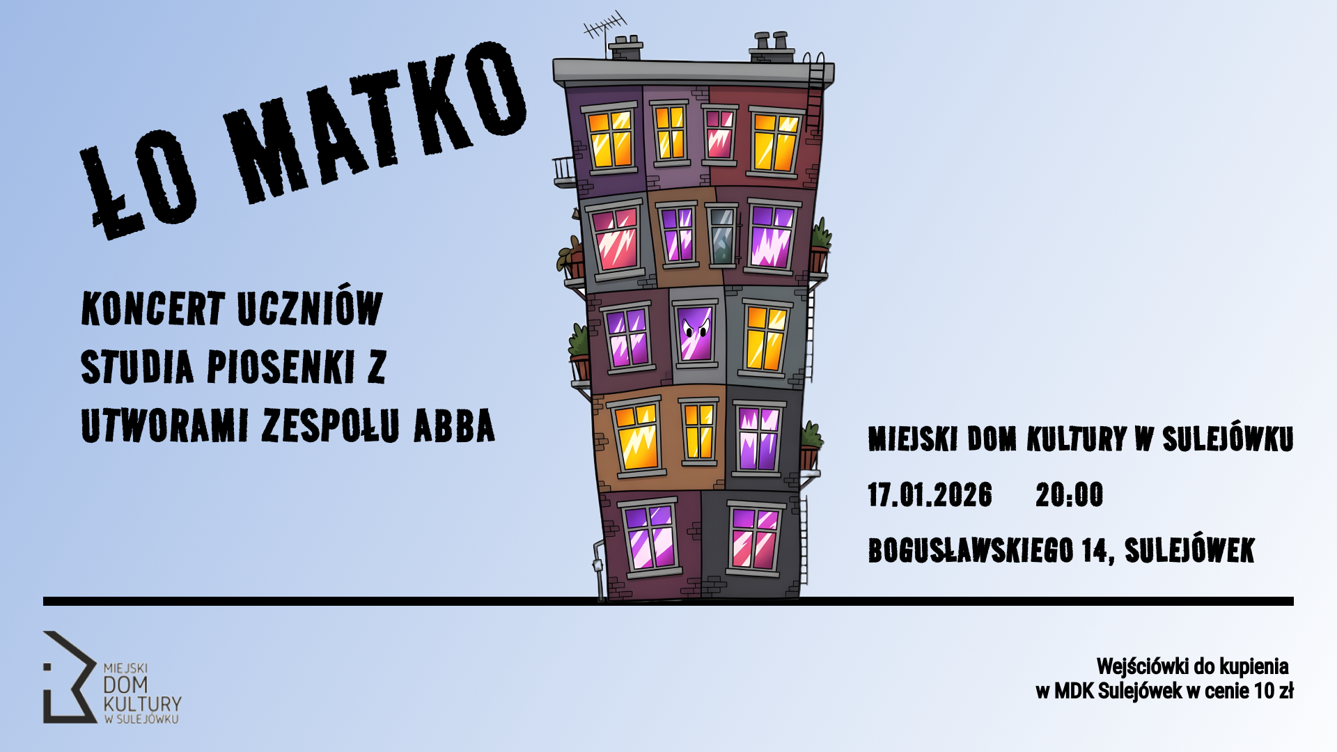 Zapraszamy na wyjątkowy koncert pod tytułem "Ło matko", gdzie codzienne historie z osiedla, marzenia ukryte pod warstwą kurzu i wielkie uczucia rodzące się w blokach...